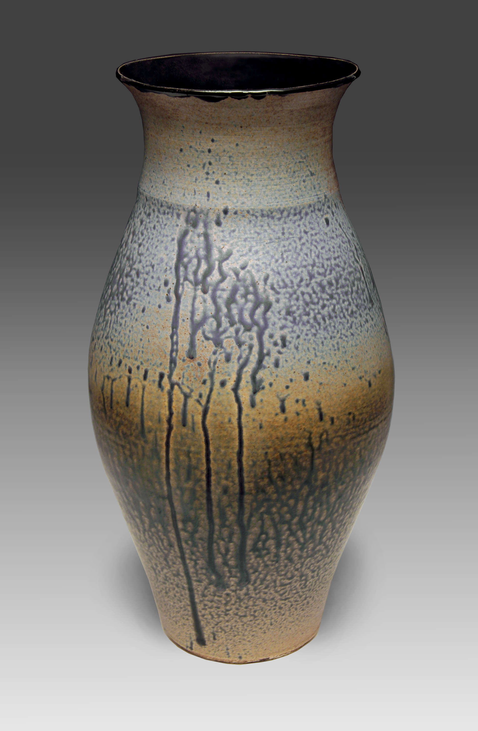 with blue over brown ash glaze, 16" tall.